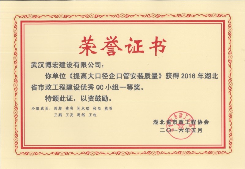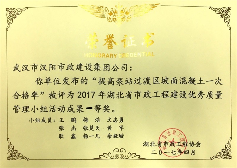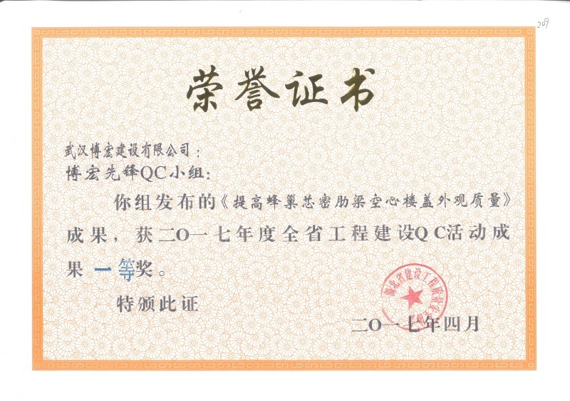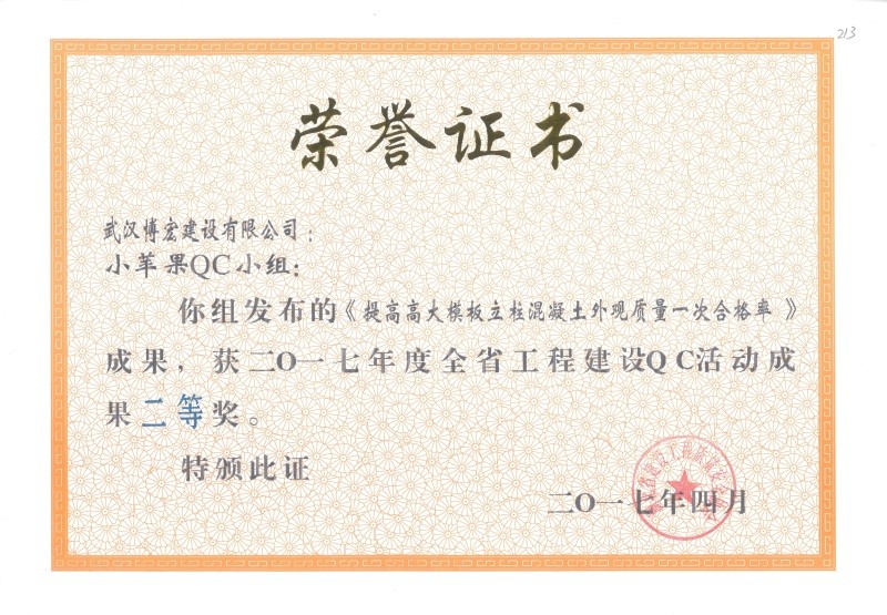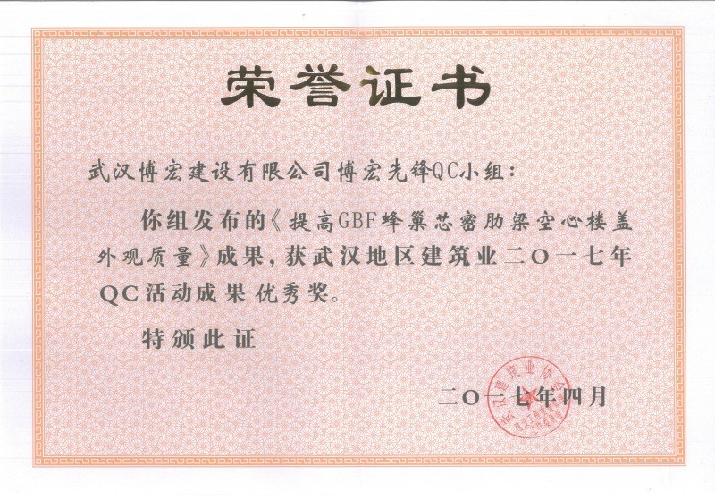 2017年武漢市地區建筑QC活動成果優秀獎(博宏先鋒小組)