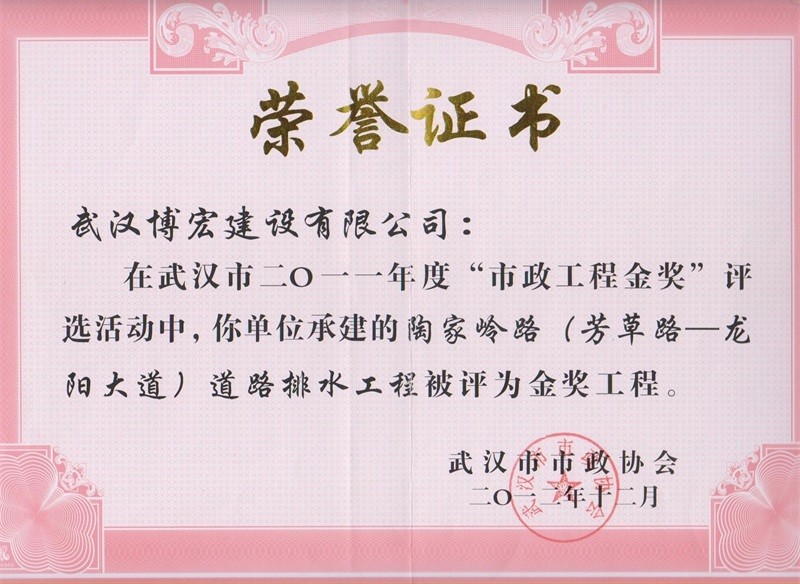 2011年度武漢市市政工程金獎(陶家嶺路道路排水工程)