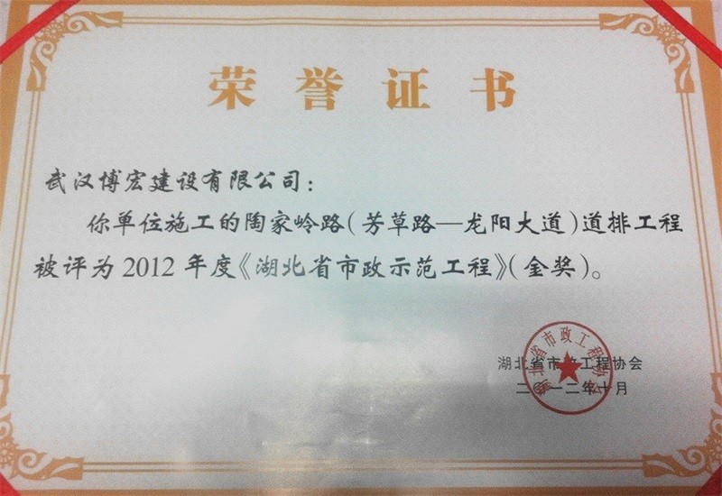 2012年度湖北省市政示范工程金獎(陶家嶺路道排工程)