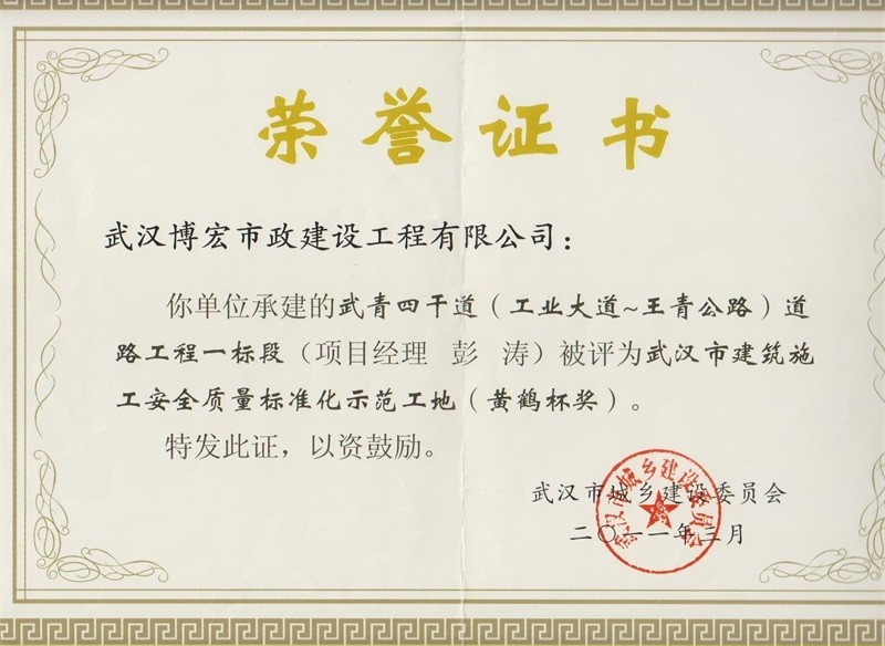 2011年度武漢市建筑施工安全質量標準化示范工地黃鶴杯獎(武青四干道道路工程一標段)