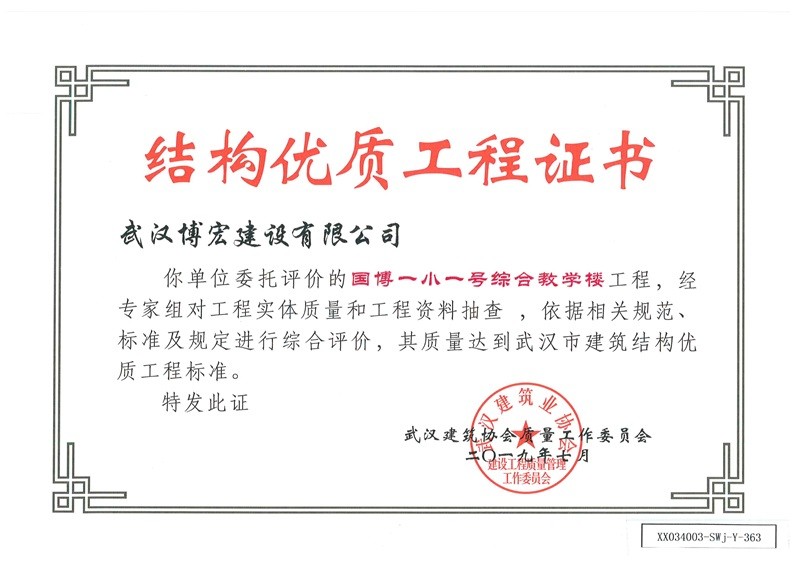 結(jié)構(gòu)優(yōu)質(zhì)工程證書(國博一小一號(hào)綜合教學(xué)樓)