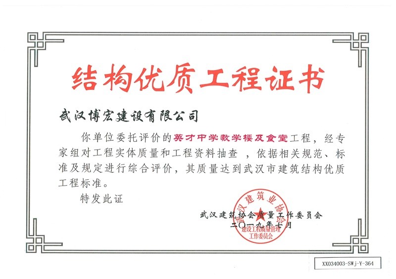 結(jié)構(gòu)優(yōu)質(zhì)工程證書(英才中學(xué)教學(xué)樓及食堂)