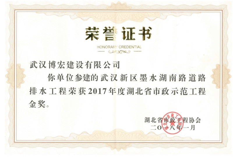 2017年度湖北省市政示范工程金獎(jiǎng)(墨水湖南路道排)