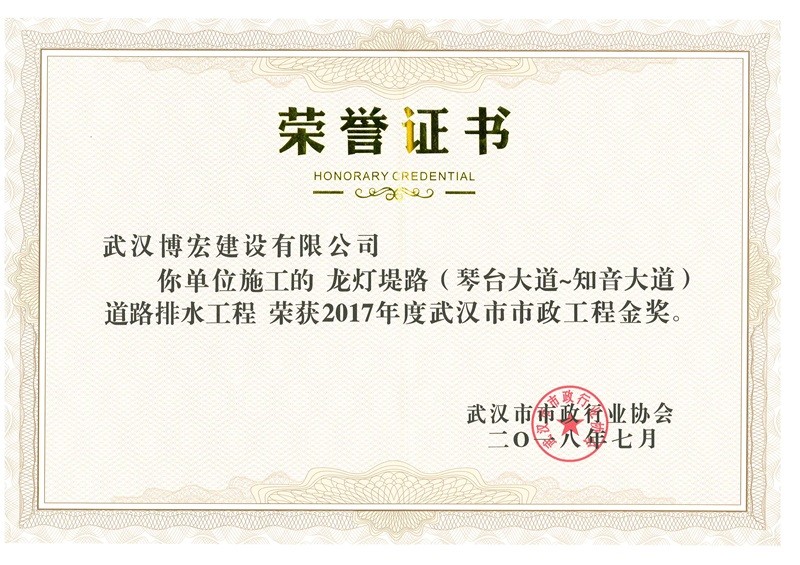 2017年度武漢市市政工程金獎(jiǎng)(龍燈堤路(琴臺大道~知音大道)道排工程)