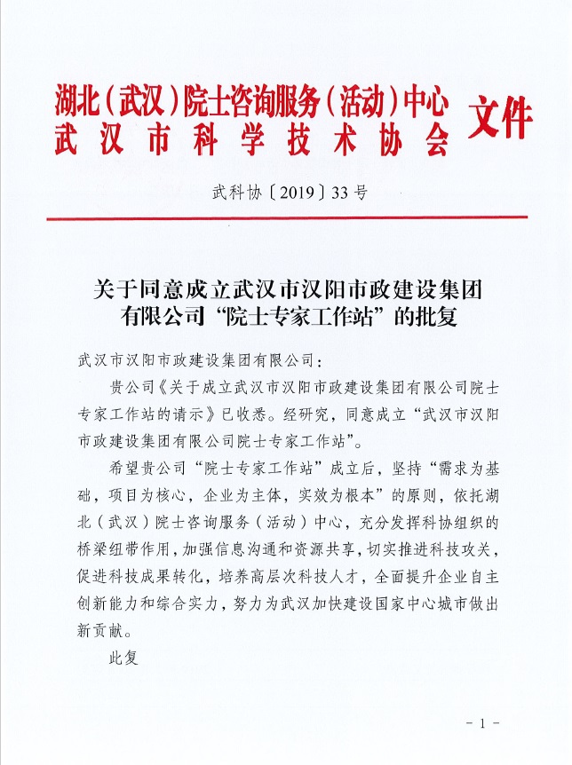 2019年5月20日,湖北(武漢)院士咨詢服務(wù)(活動)中心、武漢市科學(xué)技術(shù)協(xié)會正式批復(fù)同意成立武漢市漢陽市政建設(shè)集團(tuán)有限公司院士專家工作站。