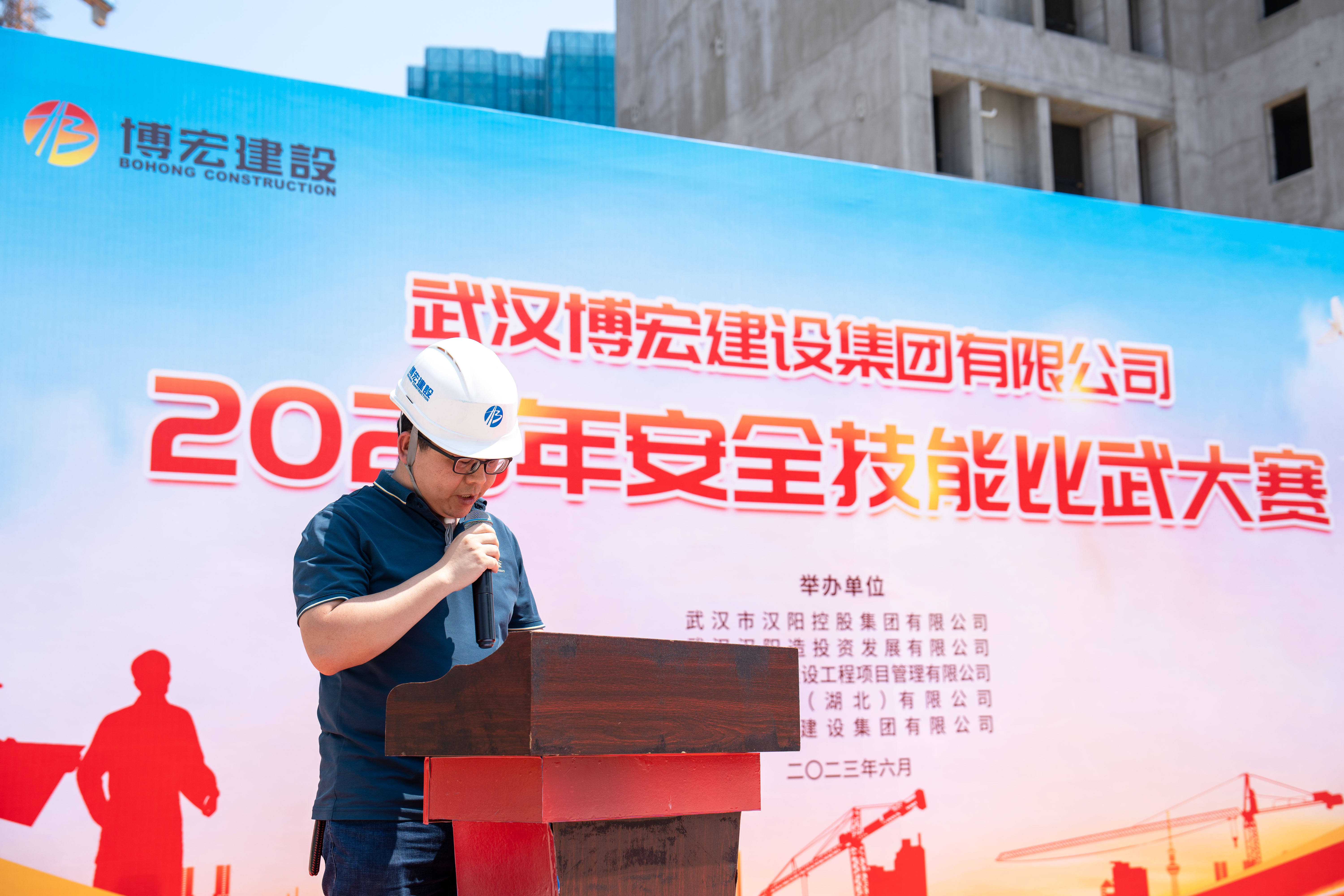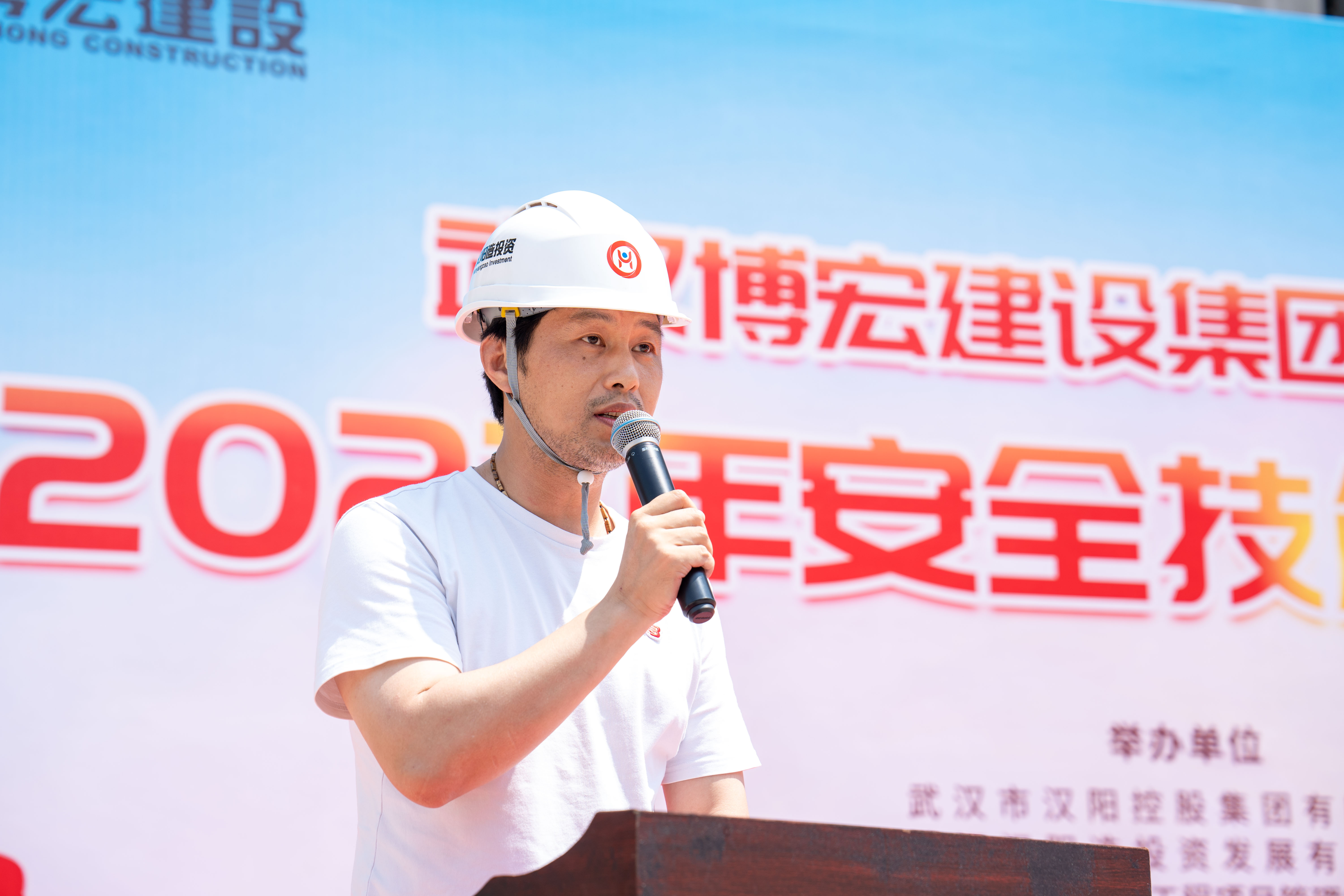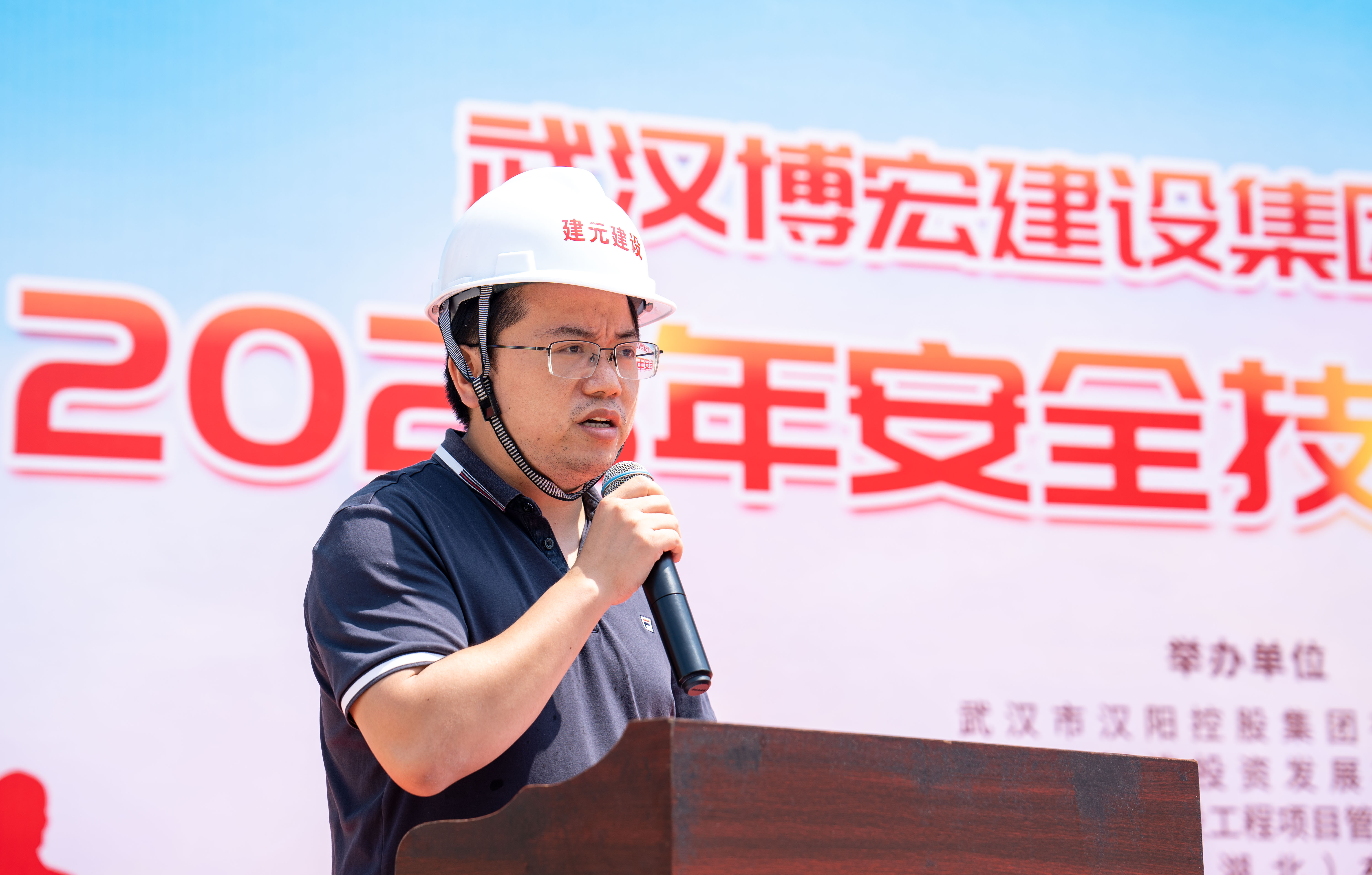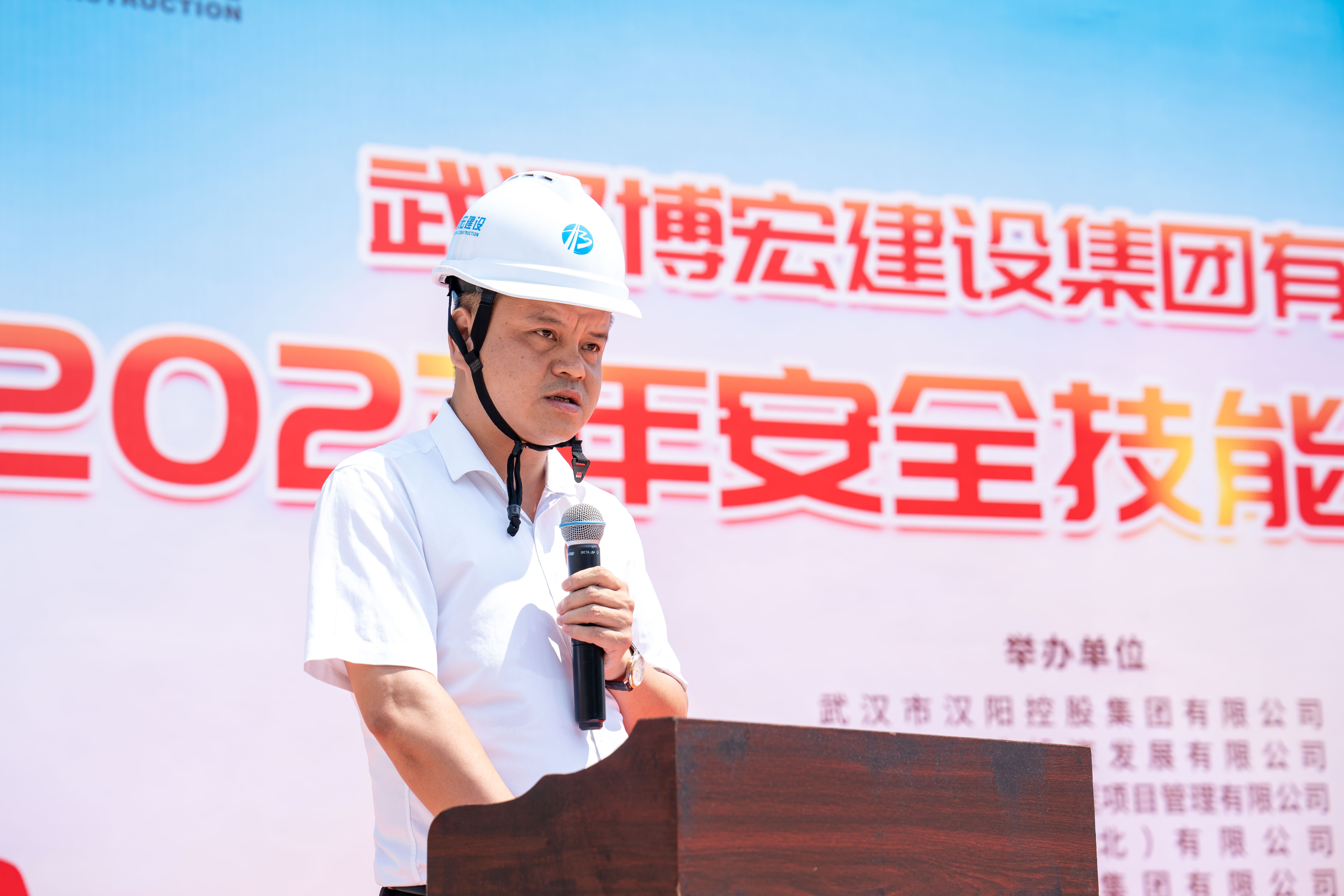 現場,武漢漢陽造投資發展有限公司工程部部長呂飛翔、武漢市建元建設工程項目管理有限公司房建部副部長劉志勇分別作出致辭及講話,表達了對本次大賽的希冀與祝福,號召參建各方攜手共進、合作共贏,認清安全管理的嚴峻形勢,振奮精神、自我加壓,消除安全漏洞,抓好安全工作,守好安全底線,開創項目安全管控新局面。